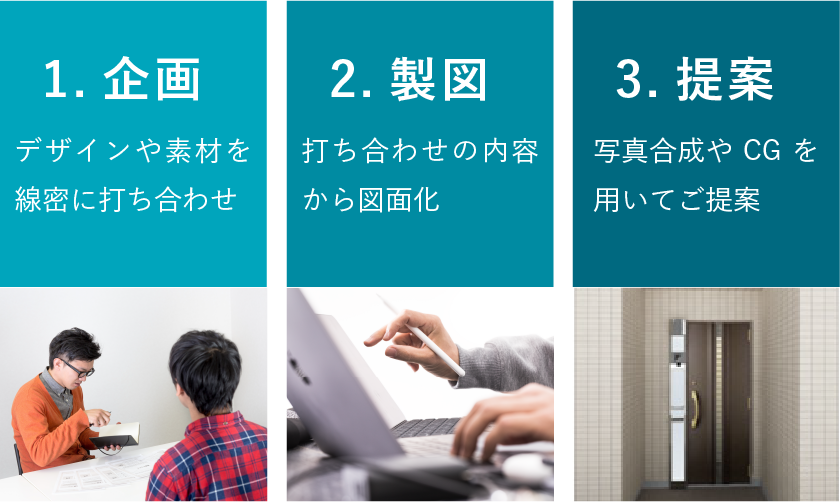 建物のイメージに合った商品がない…。そんなときには、特注のデザインにも対応しております。インターホンパネル、そして金物製作で培ったノウハウを生かし、設計から製作まで自社一貫体制でお客様のご要望を形にいたします。お気軽にご相談ください。